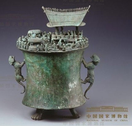 有一件贮贝器表现的是杀人祭祀的诅盟场面:广场上陈列着大铜鼓,人头汹涌,作为祭祀的奴隶被捆住,在柱子上盘绕的巨蛇即将吞噬他,神气活现的女奴隶主坐在轿子上已经驾临,祭祀即将开始。