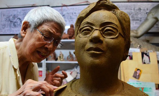 2011年9月14日,雕塑家闫玉敏正在创作作家石楠塑像。