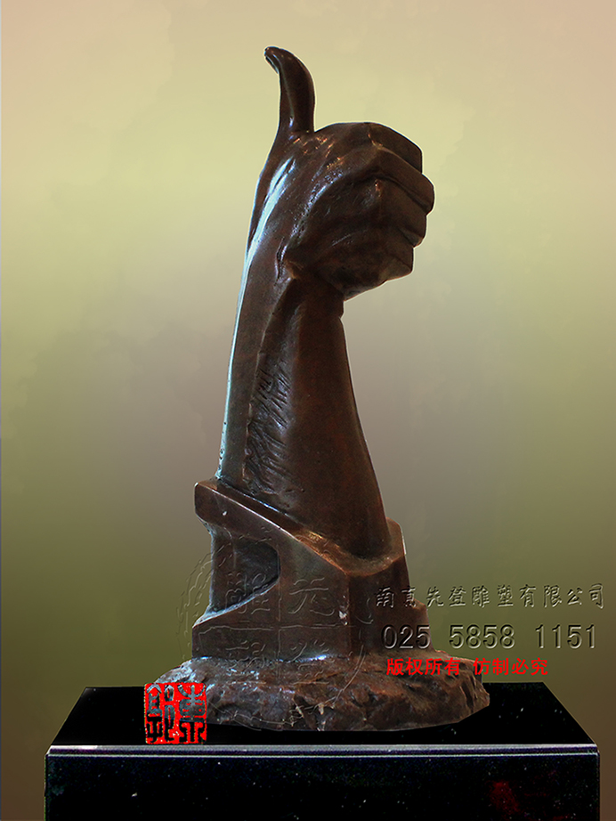 若要用一个词来形容眼前的雕塑,莫过于“芝华士”了,沿用克里斯汀·拉科鲁瓦对芝华士的评价“在我看来,有些名字,哪怕只是听人提起或在书中偶遇,就会不自觉地将其与'声名显赫'联系起来,因为这些名字本身就代表着一种品质、一种权威或者一种奢华气质。对我而言,'芝华士'这三个字就是'时尚'、'奢华'、'尊贵'的代名词。”一种酒何以用“奢侈”、“最贵”、“时尚”来形容?路人皆知,喝芝华士是一种享受,将酒提升为艺术,由内而外的品鉴,是一种边缘文化潮流化,这一切不仅源于调酒师Colin Scott以及精湛绝伦的技术,而且他拥有世界顶级设计师克里斯汀·拉科鲁瓦、亚历山大•麦克奎恩。然而一尊雕塑,何以用一种酒来代称?其实不然,芝华士的定义早已并非一樽酒而已,芝华士,享有世界苏格兰高级威士忌,他是外在与内在的统一,诚如雕塑所塑造的举起的大拇指,同等的是一种边缘文化,她需要人们鉴赏品位,需要足够的情趣与审美素质。如同芝华士所代表的“时尚”“豪华”“尊贵”,雕塑依然具有最豪华的阵容,华丽端庄的金箔,刚毅的轮廓,以及人类机理特征所表现的自然之美,他是艺术家独具匠心的杰作,是一樽东方的皇室威士忌,享有与芝华士同样的尊荣。用它来界定雕塑,而且是眼前独具匠心的雕塑,是源于其洗净铅华般的唯美设计风格以及其醇和出众的口感,如雕塑从内而外,周身所散发出的气质。