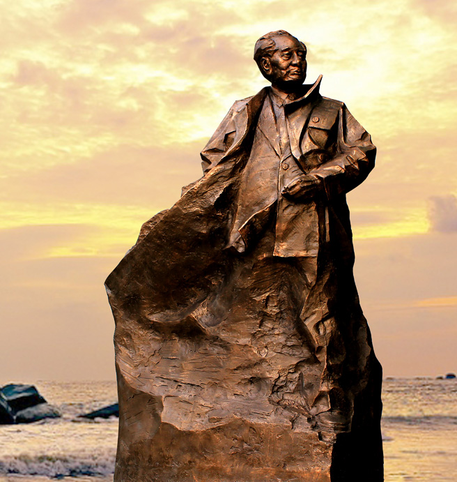 “愈益完美”是在雕塑的情动之美里展现出来,雕塑塑造的并不是个暗哑的人,而是有内中情动,用一种人类崇高的方式表达出来,你可以理解无声,但却掩盖不了汹涌在作品下,汹涌在大陈岛开拓者内心的情动,这与雕塑是暗合的,与大陈岛亦是暗合。雕塑用“蒙太奇”的手段,将不同的的人物在不同的时间段活动表达衔接。如电影片段,第一尊“垦拓”雕塑是塑以群雕的形式,有人拾起铁锹,有人举起木夯,还有一人喂哺羊羔,众人都是不遗余力开拓这片疆域。如同雕塑中塑造的旗帜,迎风鼓动,猎猎作响。旗帜的安插,是一种肯定、一种精神的导引,那一群开拓者如同将士,将士只有在一片不毛之地垦拓,而并非在开拓好了的疆域里征战。大陈岛的开发便也是如此,城市市场饱和,人类情感饱和的状态下,大陈岛的开发是势之趋,大陈岛的未来便也如下面的雕塑,是一种观望,如第二尊“观望”雕塑,以山体为型,然却在这之中的变化间,塑造了一尊老人的面容,他在眺望,眼神深邃坚定,内中透有浓浓的情感,似在望那迟归的捕鱼人,而老人旁边同样铸造一个小男孩,他在看,他海的那边会是什么,看海上升腾起的红日,看归来的父母。对美好事物的信仰,这片土地,寄托的是开拓者的信仰,他们坚信,在努力之下必定结出硕果,而那第三尊“濠濮间想”雕塑便是他们眼中的美好,他们未来生活的境遇会是这样一幅谐和的画面,一妙龄少女坐在海边礁石上,有海鸥逐浪翻涌,人物与自然界相拥,物我相忘。