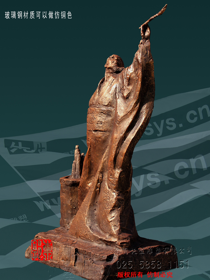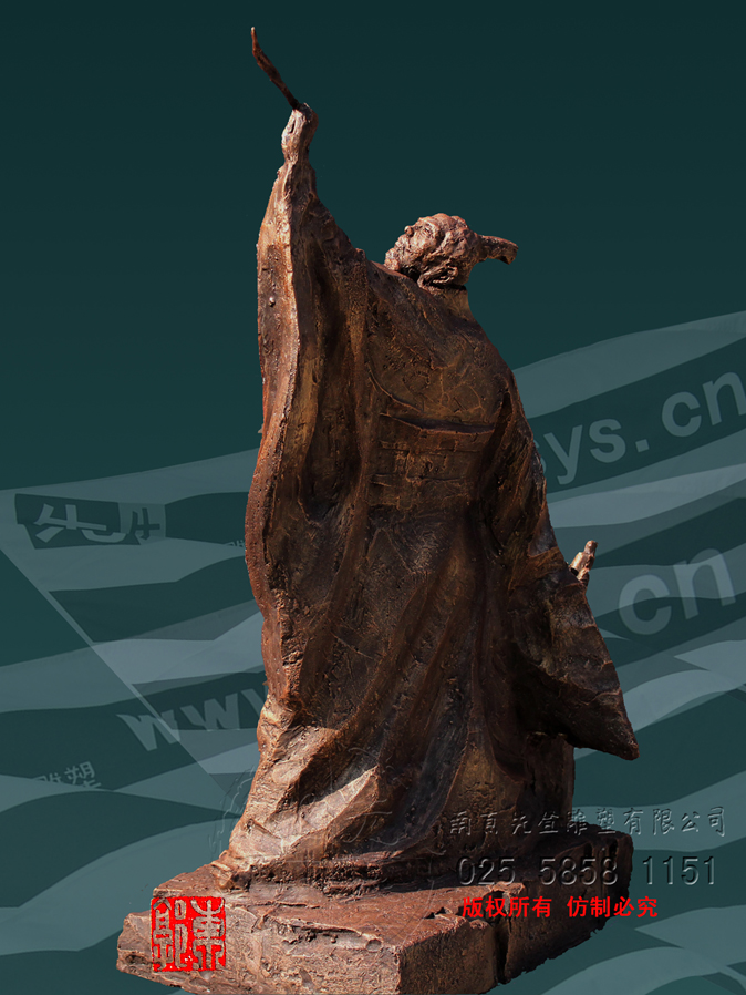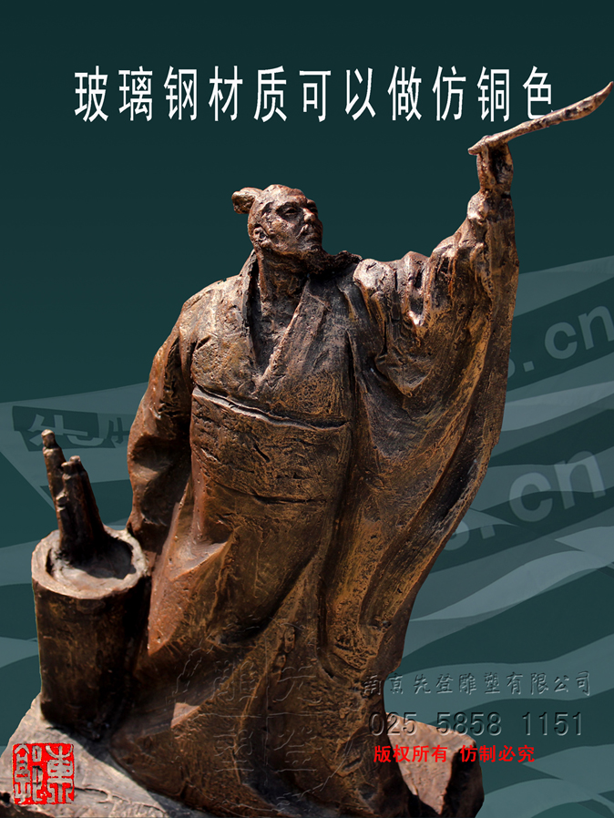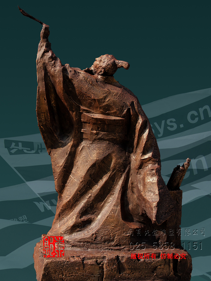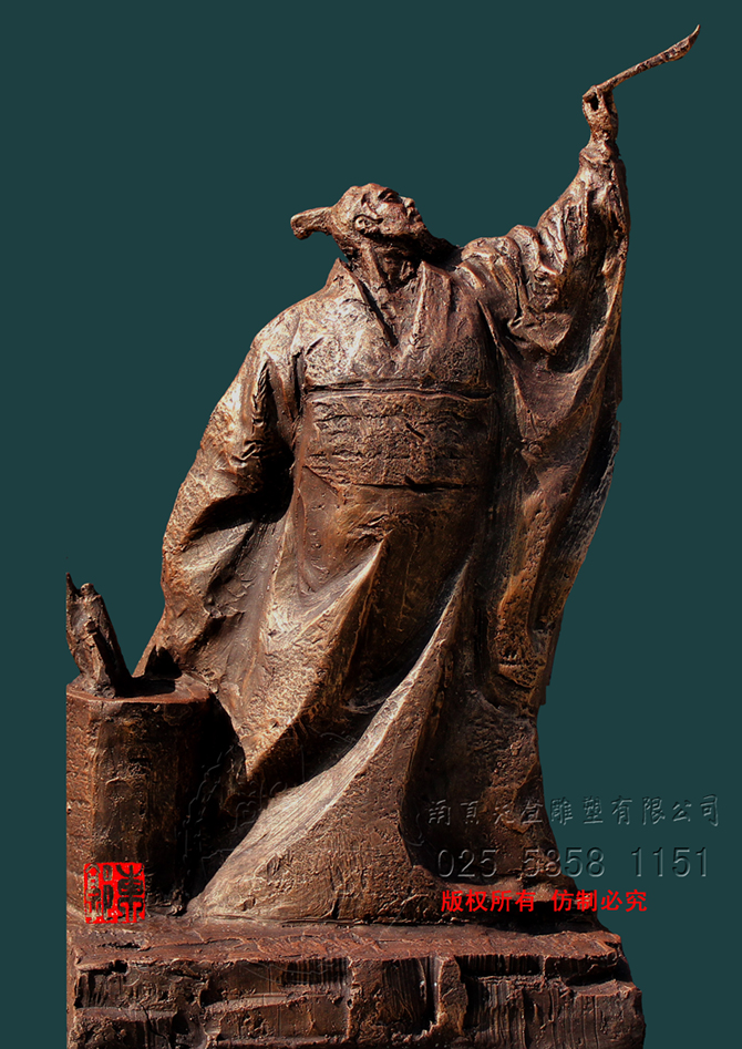 张芝字伯英,出生官宦之家,幼时高操,勤习学书,朝廷赏识,令他做官,而他并非贪图高官厚禄,甘做布衣。素日临池学书,得崔杜之法,复而变之,遂成“今草”。张芝对书艺痴醉令人惊叹。卫恒《四体书势》里有言“凡家之衣帛,必先书而后练之。临池学书,池水尽墨。”张芝对于书法艺术的不断索求,终成一代“草圣”,当是“为世所宝,寸纸不遗”。雕塑里张芝如平日习作,但见他扬手,握管,在虚空中纵姿挥毫,一如其书法,一笔而就,不拖沓凝滞,衣袍素袖宛如字之体势婉转流畅,舒笺观鸟迹,研墨染鱼缁。